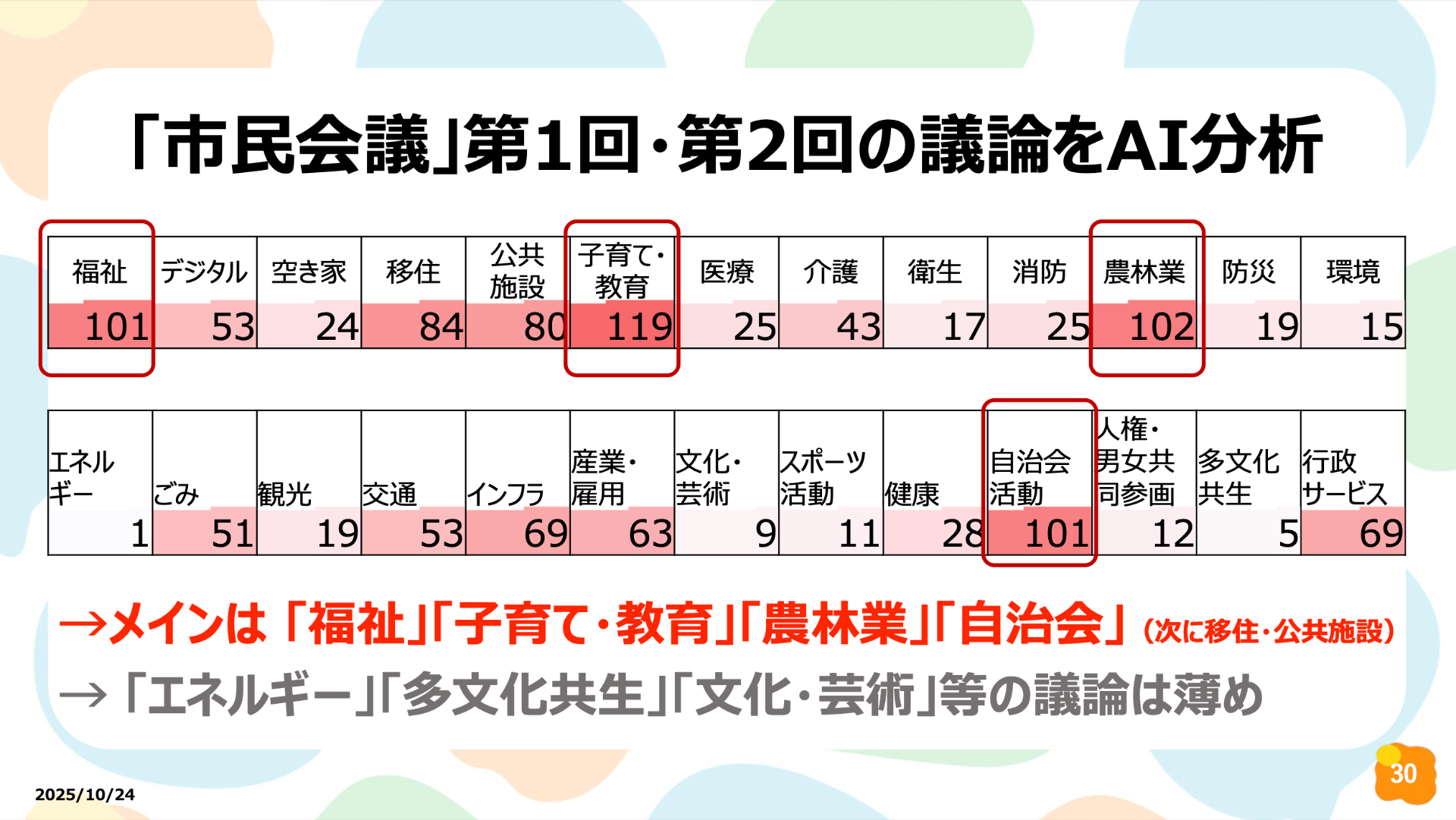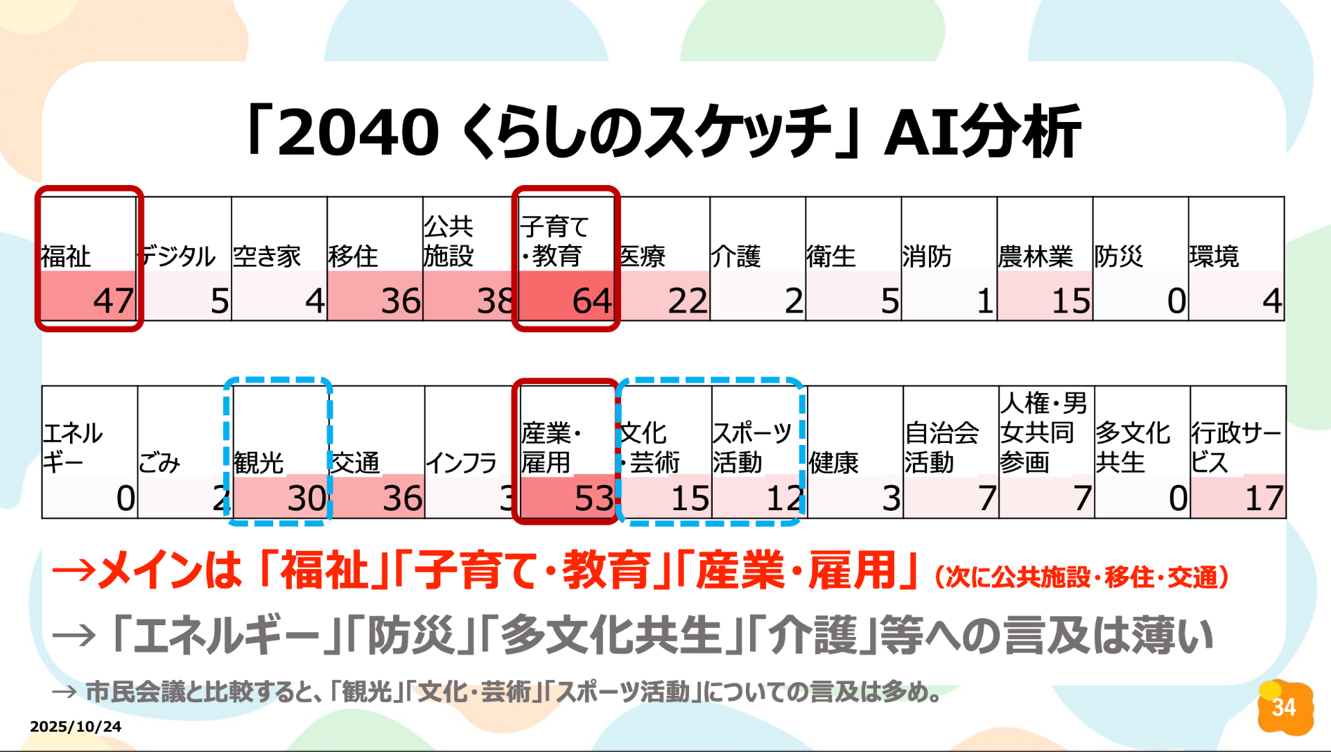 対面会議: 「福祉」「子育て・教育」「農林業」「自治会」といった、暮らしに直結する身近な課題が多く話題に上がっていました。