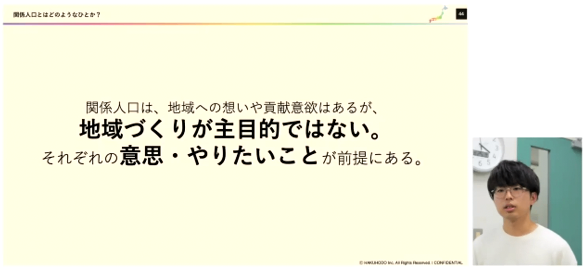 最後に、「しくみ」が重要です。 ひとと出会い、対話することやコンテクストに触れ、地域を理解・解釈することはかなり労力のいることです。そして、これは地域住民と関係人口どちらにとっても同様であり、持続的ではなく、不健康です。特定の誰かだけが大変な思いをしないように、地域住民と関係人口にとってWin-Winになれる「しくみ」をつくることが必要だと川上さんは訴えられました。